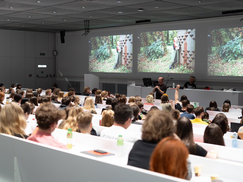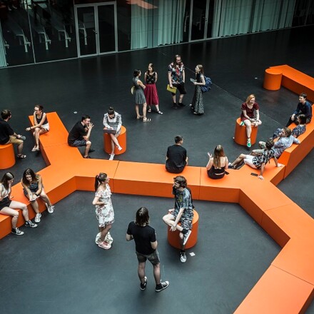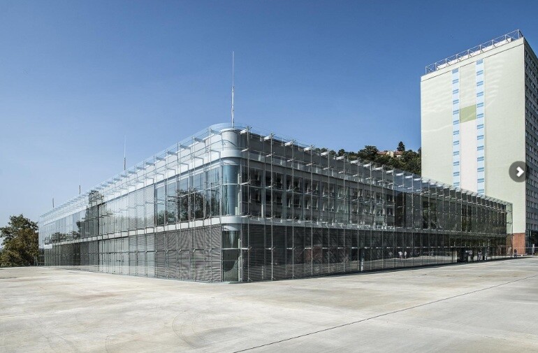V roce 2020 jsme se přestěhovali do nové budovy s výrazným futuristickým stylem. Získala architektonickou cenu, objevila se ve filmu a hostila několik koncertů. Minimalistický prostor doplňuje pohodlná studentská místnost, velká knihovna se studovnou, menza přístupná podzemní chodbou – se skvělou pizzou. Sídlíme v pražské Troji, pár zastávek od zoo a kousek od živých Holešovic plných kaváren, divadel, bister, galerií i klubů.